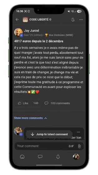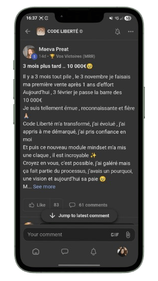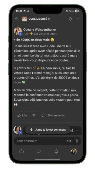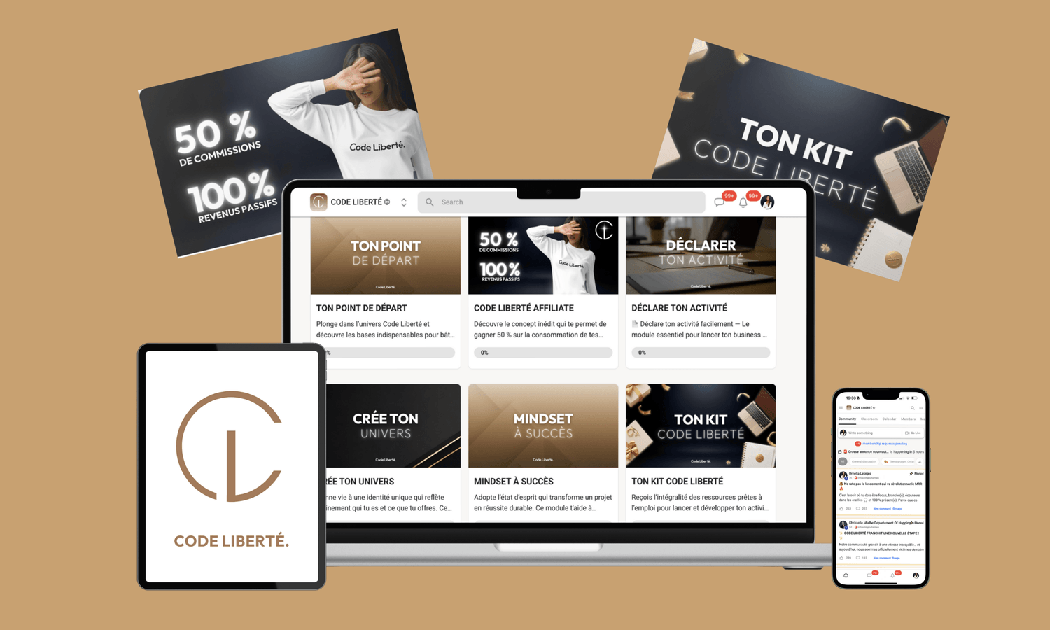 Tu reçois la formation Code Liberté et aussi l'accès à une communauté gratuite d'entrepreneurs du monde entier, tout niveaux d'expérience confondu, prêts à se connecter avec toi et te soutenir !